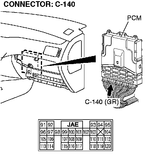 STEP 8. Check PCM connector C-140 for loose, corroded or damaged terminals, or terminals pushed back in the connector.