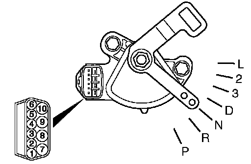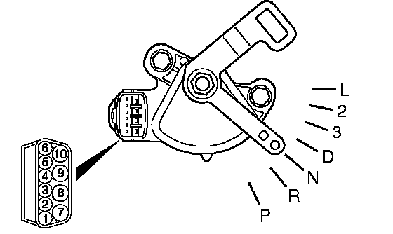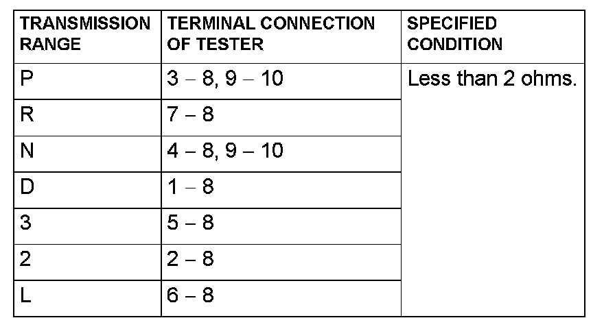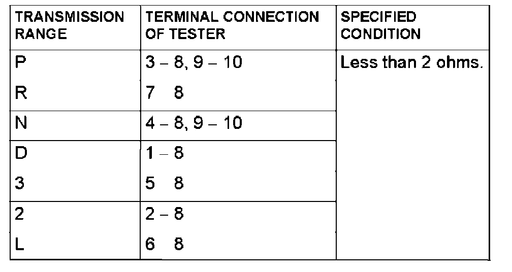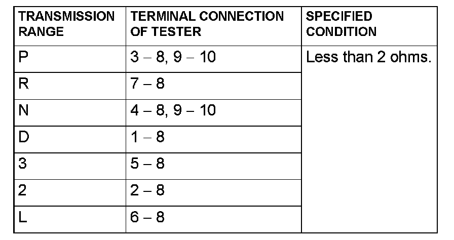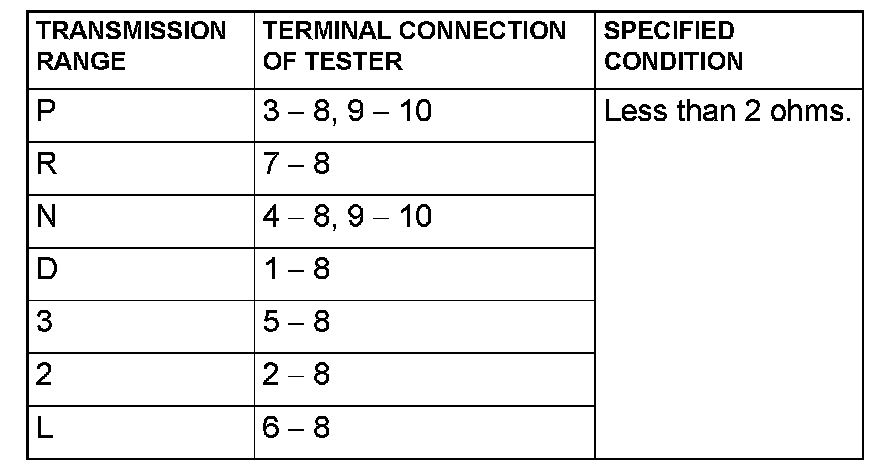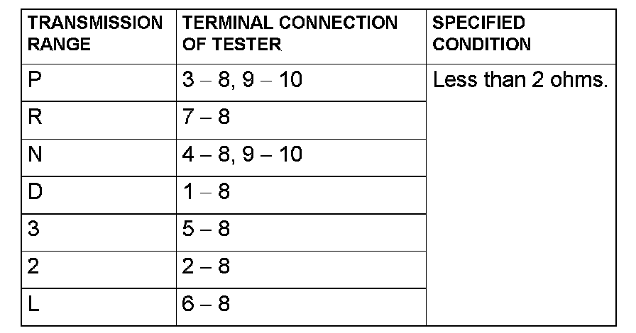 Measure the resistance between the terminals for each transmission range as indicated in the table below.