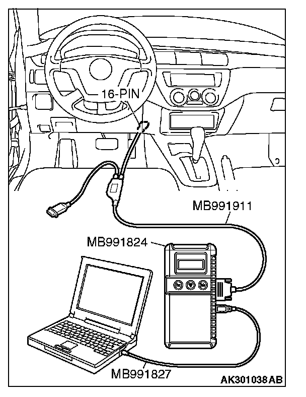 CAUTION: To prevent damage to scan tool MB991958, always turn the ignition switch to the "LOCK" (OFF) position before connecting or disconnecting scan tool MB991958.