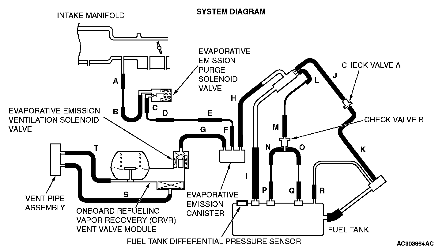 - When the evaporative emission purge solenoid is off, the fuel differential pressure sensor output voltage remains 1.0 volt or less for ten seconds.
