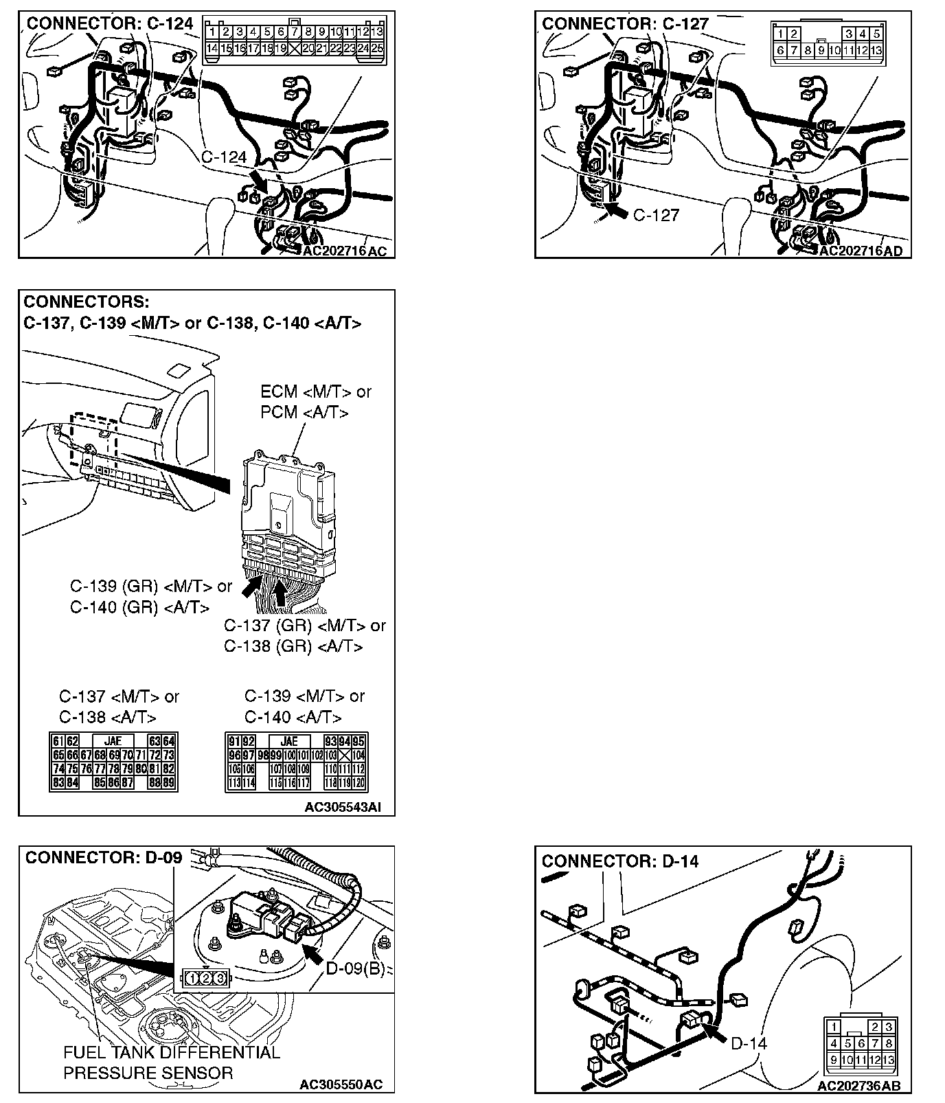 STEP 9. Check intermediate connectors C-105, C-124, C-127 and D-14 and ECM connector C-139
