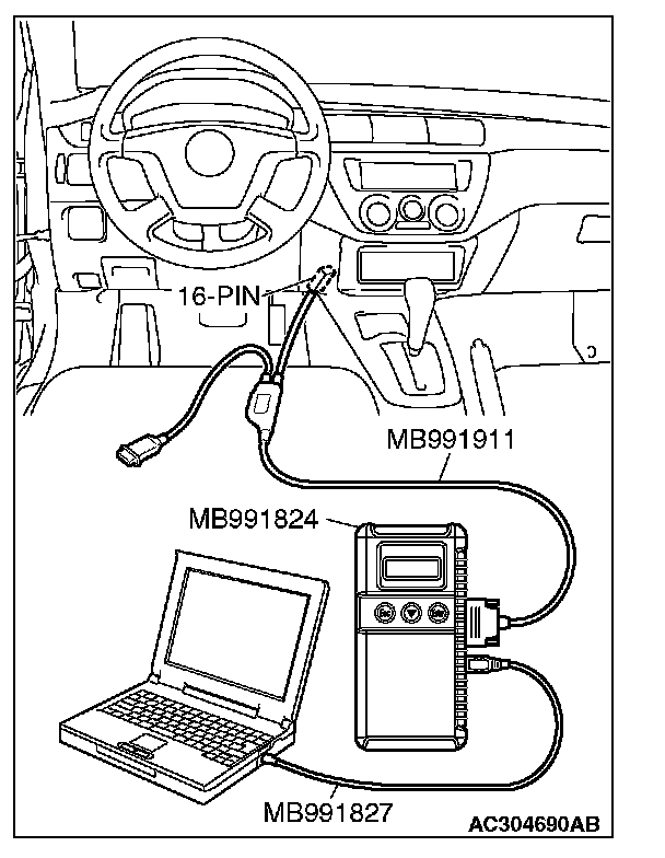 CAUTION: To prevent damage to scan tool MB991958, always turn the ignition switch to the "LOCK" (OFF) position before connecting or disconnecting scan tool MB991958.