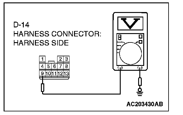 3. Measure the voltage between connector D-14 terminal 9 and ground.