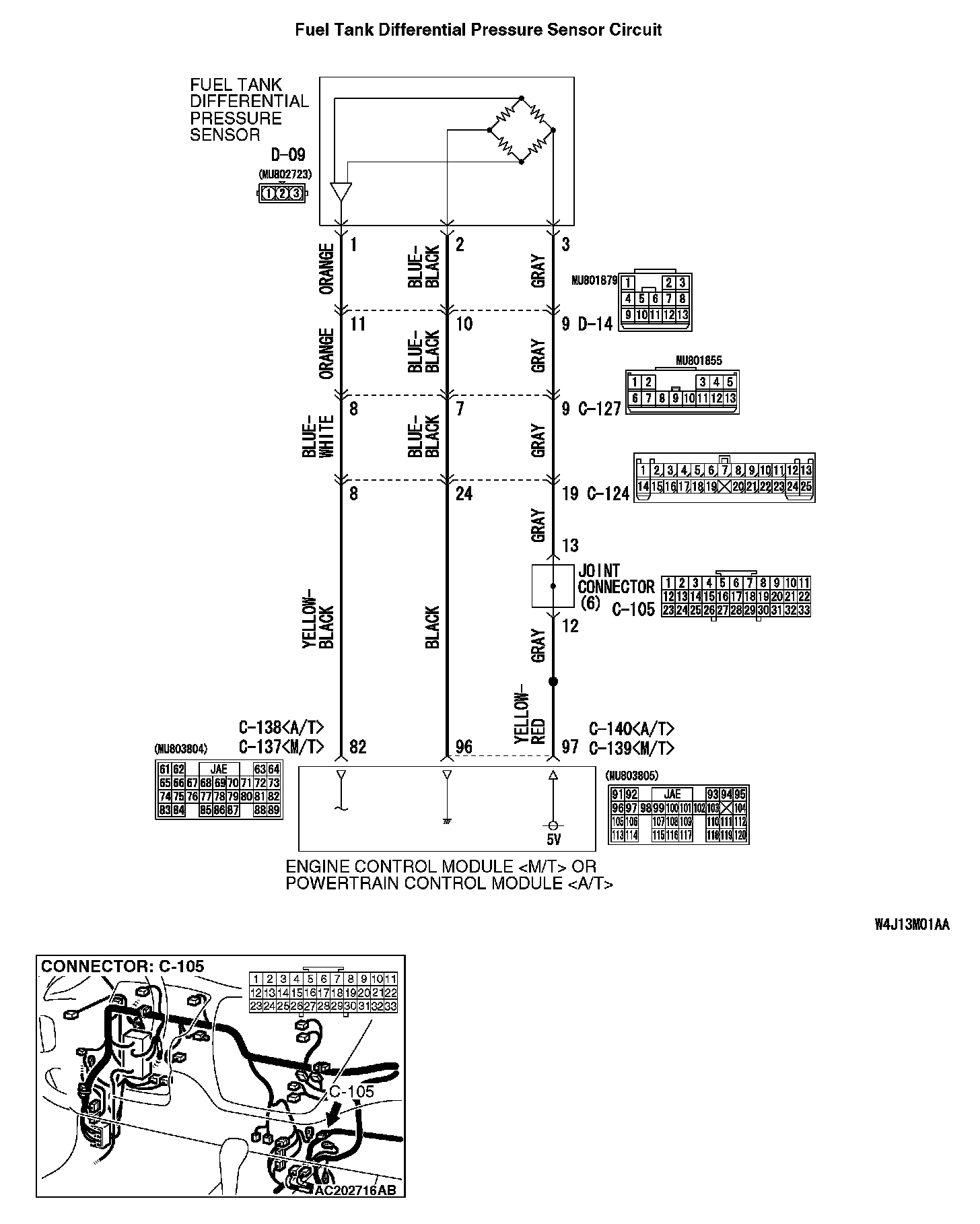 - The fuel tank differential pressure sensor (terminal 1) returns a voltage signal to the ECM