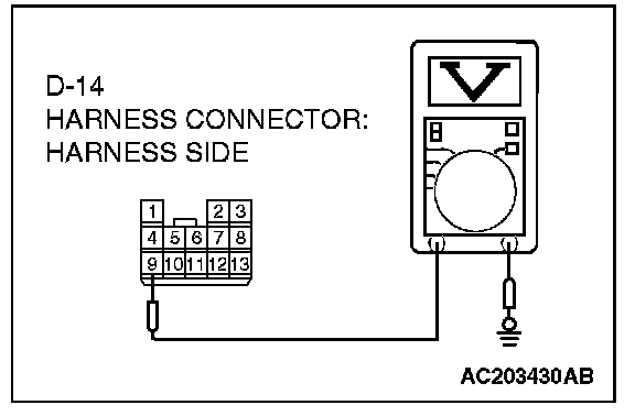 3. Measure the voltage between connector D-14 terminal 9 and ground.