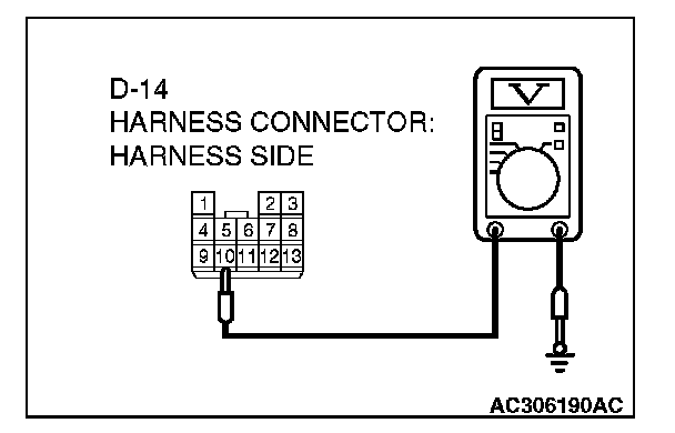 3. Measure the voltage between connector D-14 terminal 10 and ground by backprobing.