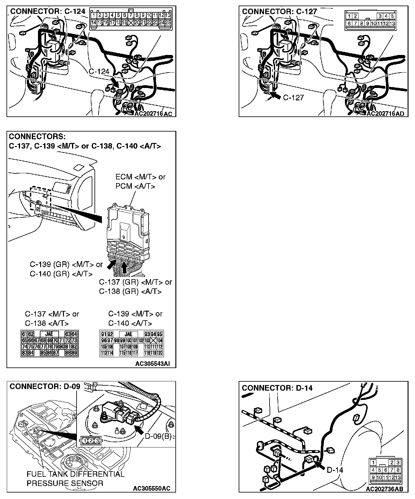 STEP 9. Check intermediate connectors C-105, C-124, C-127 and D-14 and ECM connector C-139
