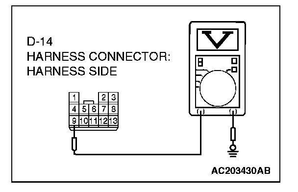 3. Measure the voltage between connector D-14 terminal 9 and ground.