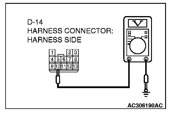 3. Measure the voltage between connector D-14 terminal 10 and ground by backprobing.
