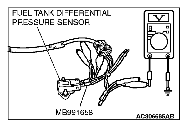 - To check for system blockage, do a performance test which uses a mechanical vacuum gauge and scan tool MB991958 set on the fuel tank differential pressure sensor (TANK PRS SNSR 73). The mechanical gauge reading is used to verify scan tool MB991958 reading. A comparison of the mechanical gauge with the reading on scan tool MB991958 will locate a problem in the system.