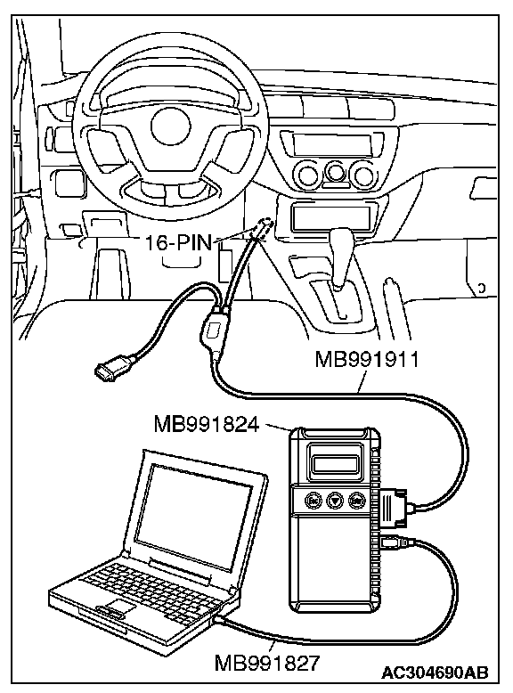 CAUTION: To prevent damage to scan tool MB991958, always turn the ignition switch to the "LOCK" (OFF) position before connecting or disconnecting scan tool MB991958.