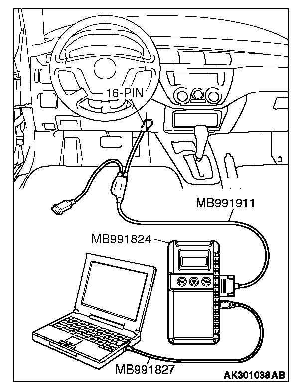 CAUTION: To prevent damage to scan tool MB991958, always turn the ignition switch to the "LOCK" (OFF) position before connecting or disconnecting scan tool MB991958.