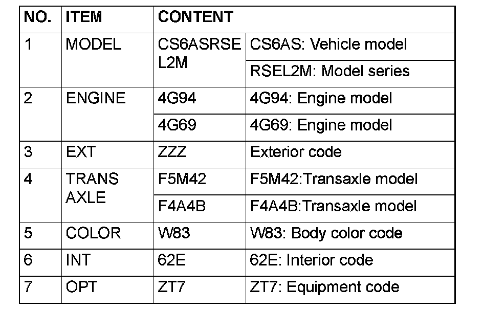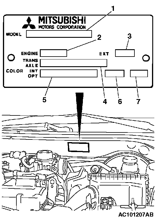 The vehicle information code plate is riveted onto the cowl top outer panel in the engine compartment. The plate shows model code, engine model, transaxle model and body color code.