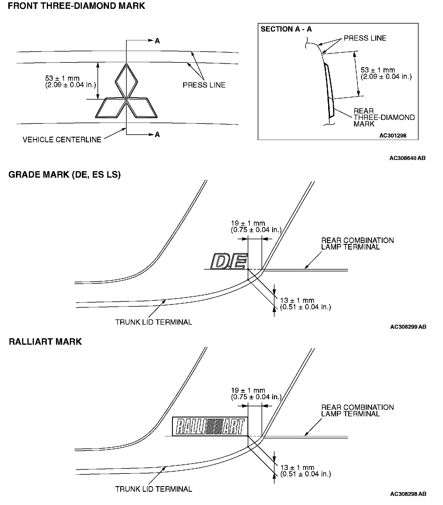 CAUTION: When attaching the marks, the ambient temperature should be 20 - 38° C (60 - 100° F) and the air should be completely free of dust. If the ambient temperature is lower than 20° C (60° F), the marks and the places on the vehicle body where the marks are to be attached should be heated to 20 - 38° C (60 - 100° F).