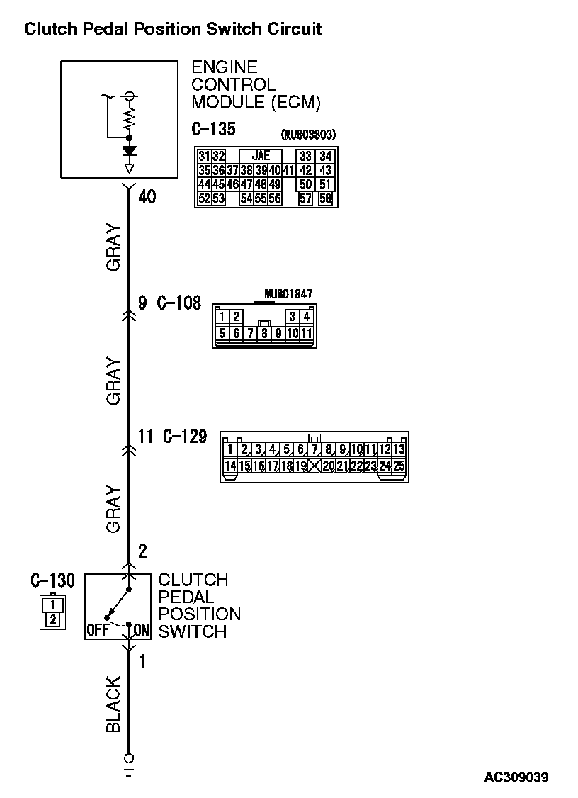 This circuit indicates the operation status of the clutch pedal position switch. When the clutch pedal position switch is ON (clutch pedal is depressed), the voltage of ECM terminal number 40 will indicate 0 volt.