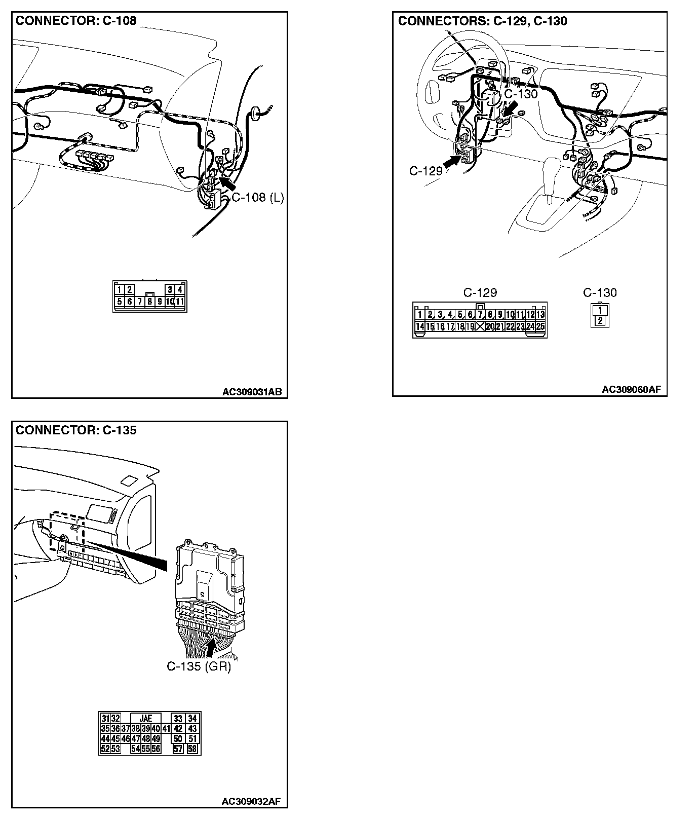 STEP 3. Check clutch pedal position switch connector C-130, ECM connector C-135, intermediate connectors C-108 and C-129 for loose, corroded or damaged terminals, or terminals pushed back in the connector.