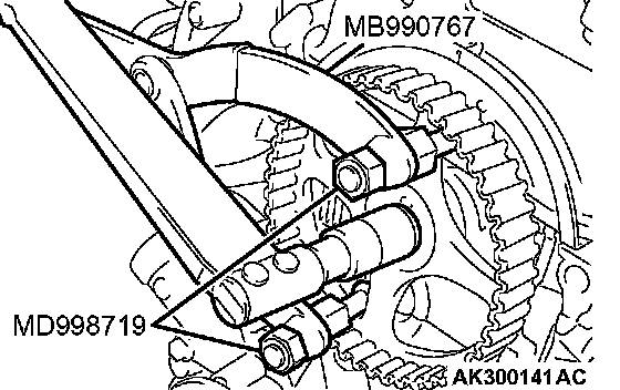 1. While holding the camshaft sprocket with special tools MB990767 and MD998719, loosen the camshaft sprocket bolt.