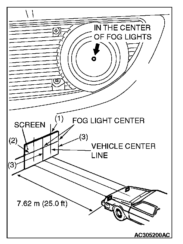 7. Place the vehicle on a level floor, perpendicular to a flat screen 7.62 meters (25.0 feet) away from the bulb center-marks on the fog light lens.