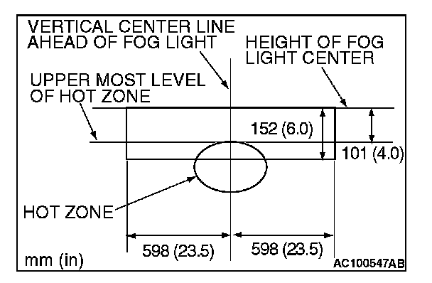 Standard value: (Vertical direction): Top of the hot zone should be 101 mm (4.0 inches) (0.76 degrees angle) downward from the height of the fog light center.