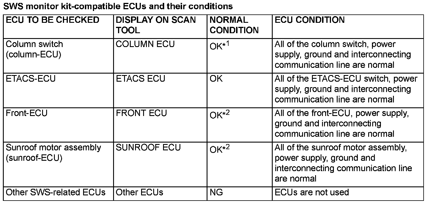 - *2: When "NG" is displayed beside the "ETACS ECU", the scan tool shows "NG" beside the "FRONT ECU" and "SUNROOF ECU".