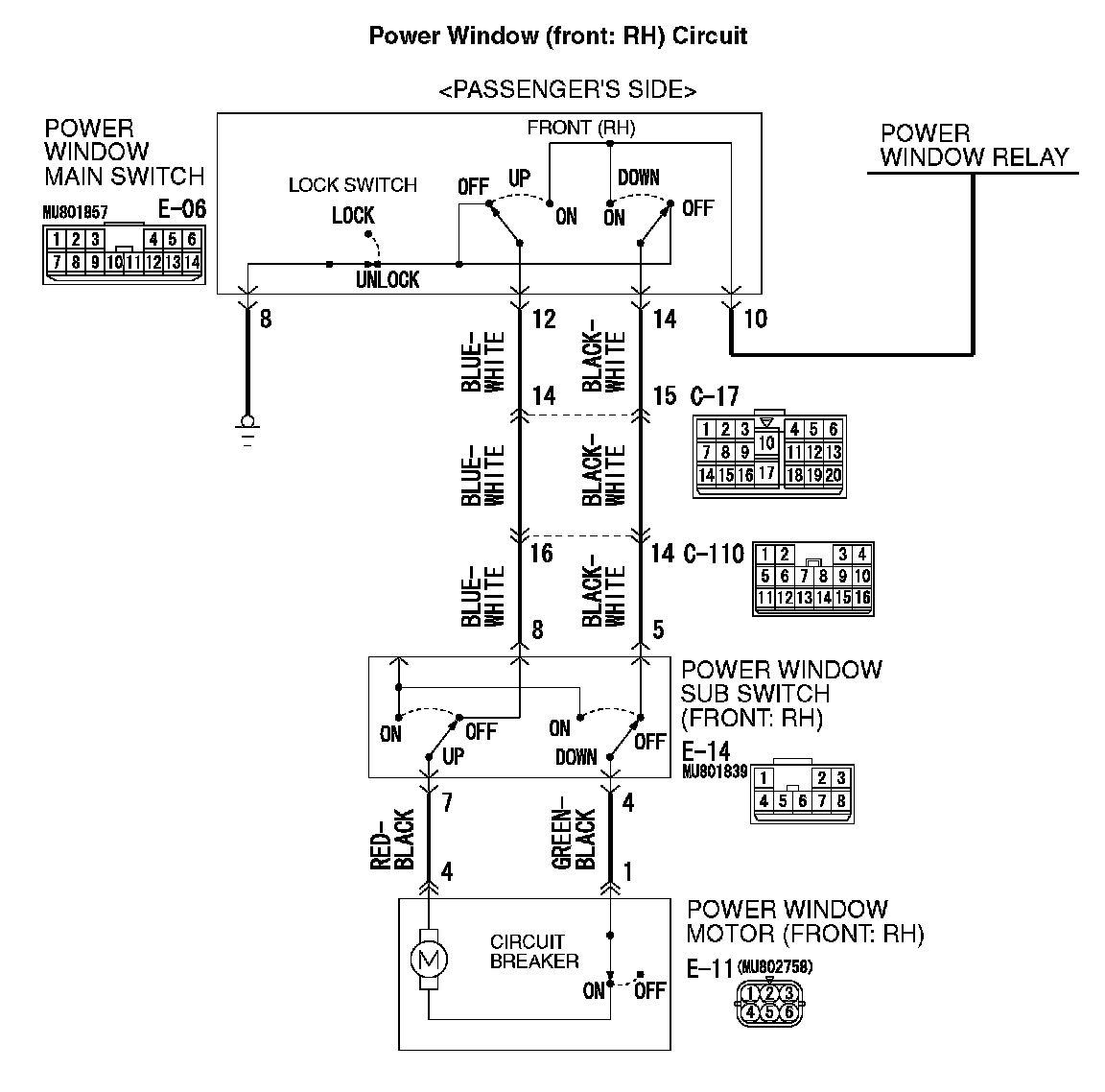 Power Windows: Front or rear passenger's power windows do no work at all by operating the power window main switch.Power Window (front: RH) Circuit: