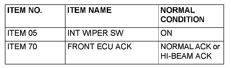 The scan tool does not show the respective normal condition for item "FRONT ECU ACK" : Replace the front-ECU. Verify that the windshield wiper works normally.