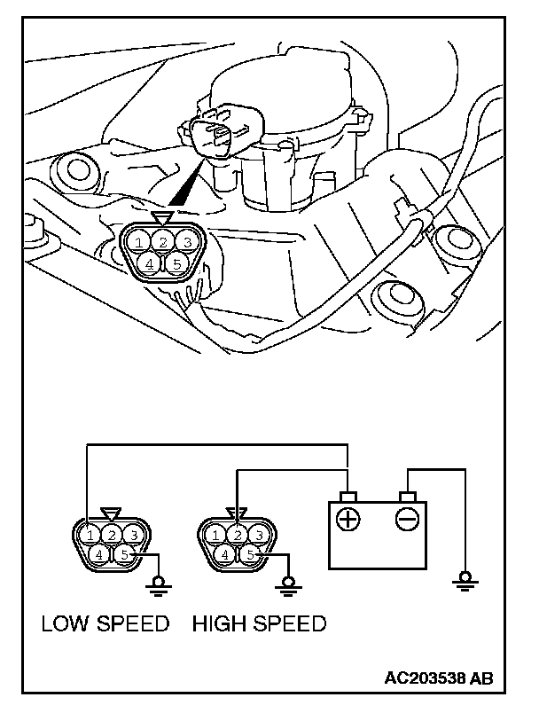 2. Connect a battery to the windshield wiper motor as shown. Then check the windshield wiper motor operates normally at high and low speeds.