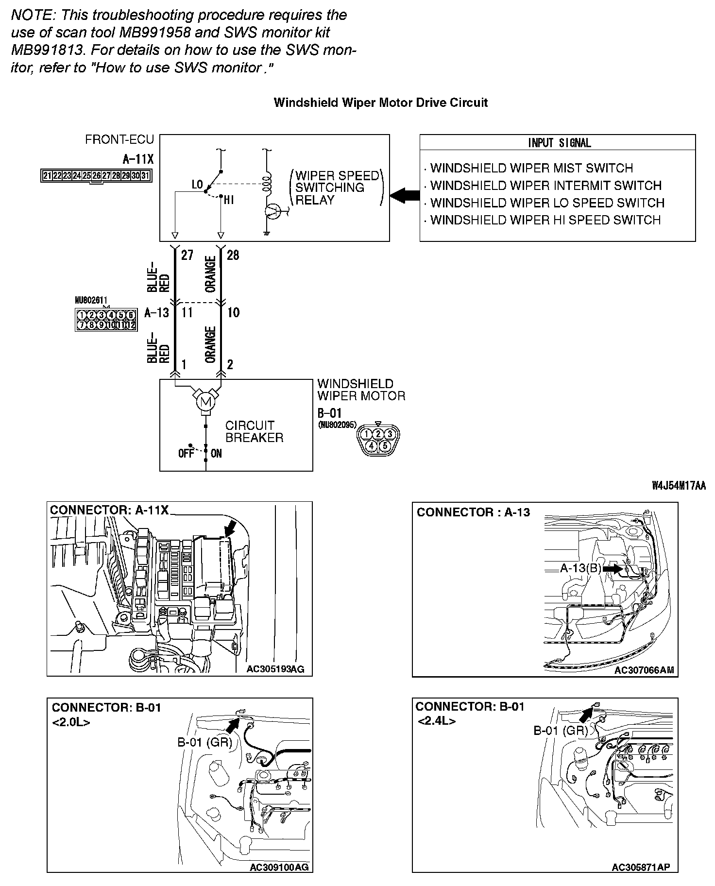 STEP 5. Check the wiring harness between windshield wiper motor connector B-01 (terminal 1 and 2) and front-ECU connector A-11X (terminal 27 and 28).