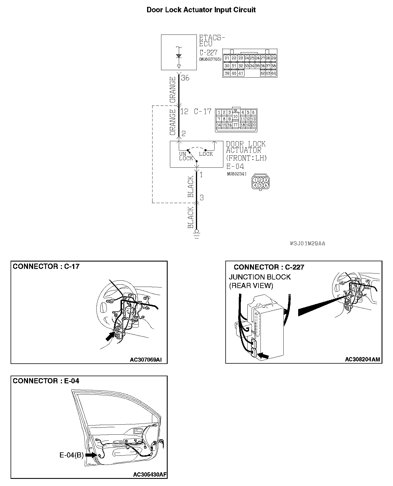 STEP 6. Check the wiring harness between driver's door lock actuator switch connector E-04 (terminal 3) and ETACS-ECU connector C-227 (terminal 36).