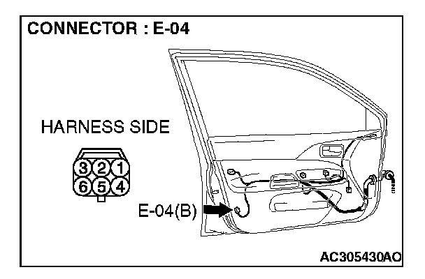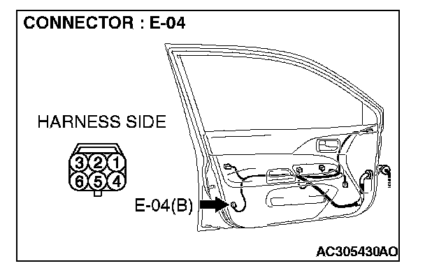 1. Disconnect driver's door lock actuator switch connector E-04 and measure the resistance available at the wiring harness side of the connector.