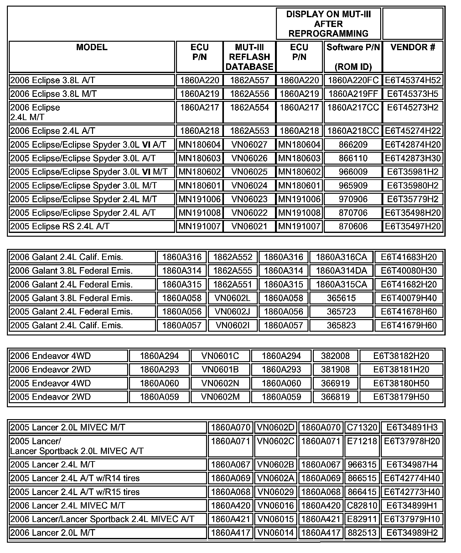 3. Using the MUT-III, verify that the vehicle's ECU part number is listed in the table in Step 8. If the Software P/N is the same as or higher than the Software P/N in the table, the PCM has already been reprogrammed for this concern. Do not continue with this bulletin procedure.