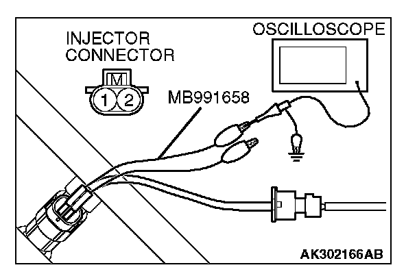 1. Disconnect the injector connector and connect the test harness special tool (MB991658) between the separated connector. (All terminals should be connected.)