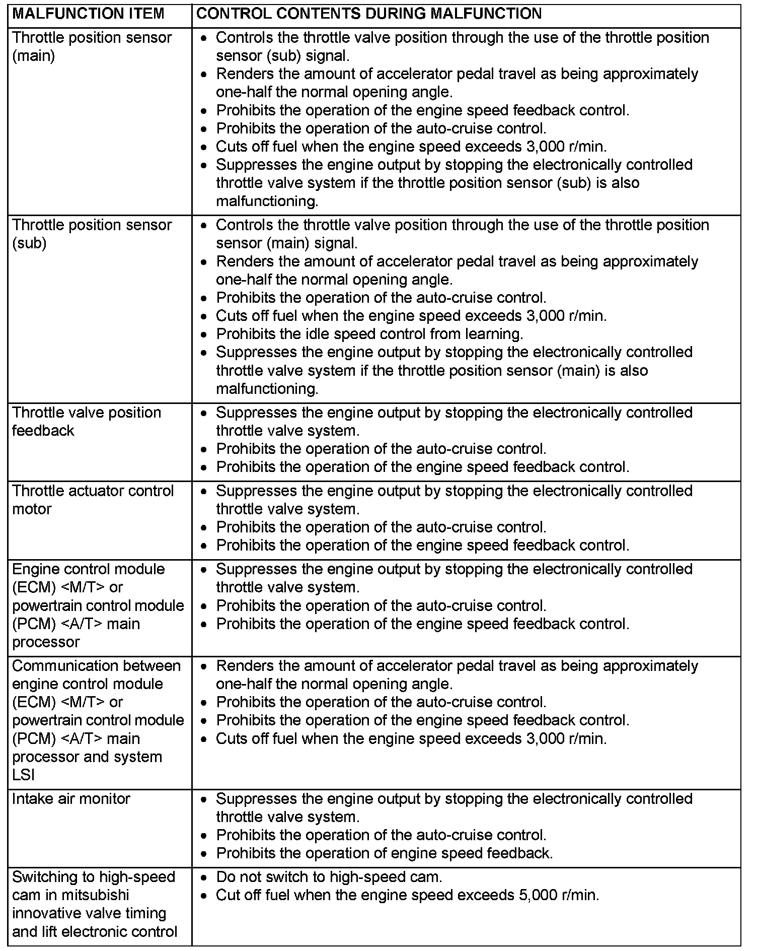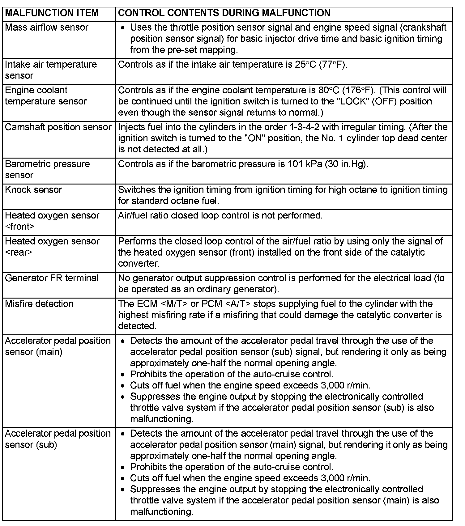 When the main sensor malfunctions are detected by the diagnostic test mode, the vehicle is controlled by means of the defaults.