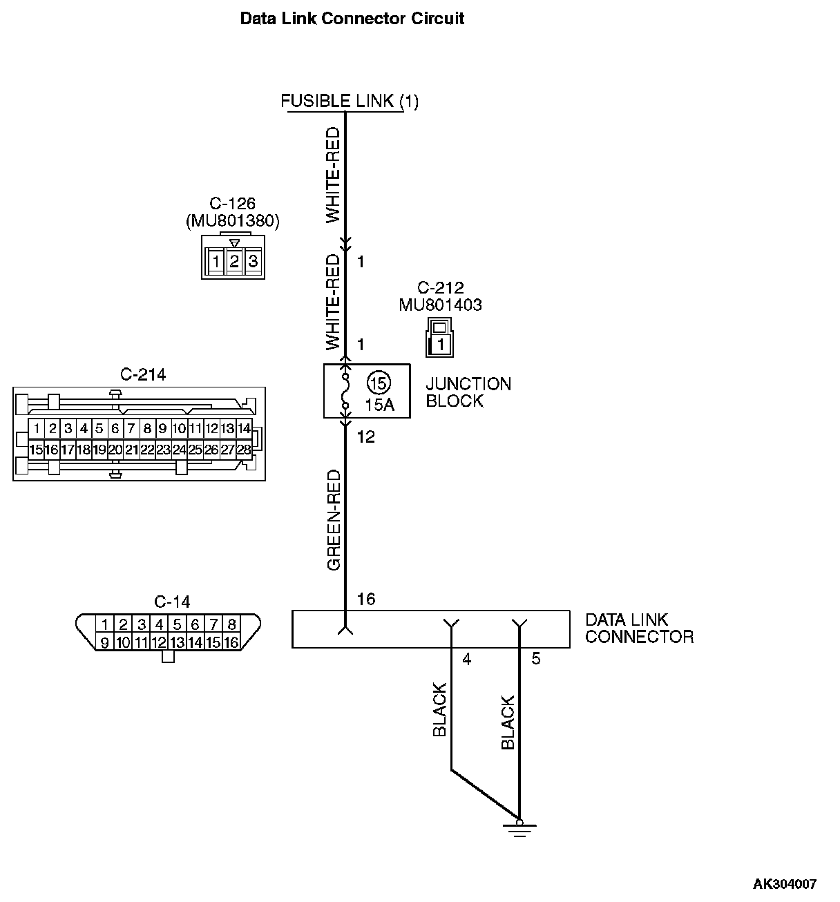 - A battery positive voltage is applied on the data link connector power terminal (terminal No.16). The ground terminals (terminals No.4, No.5) are grounded to the vehicle body.