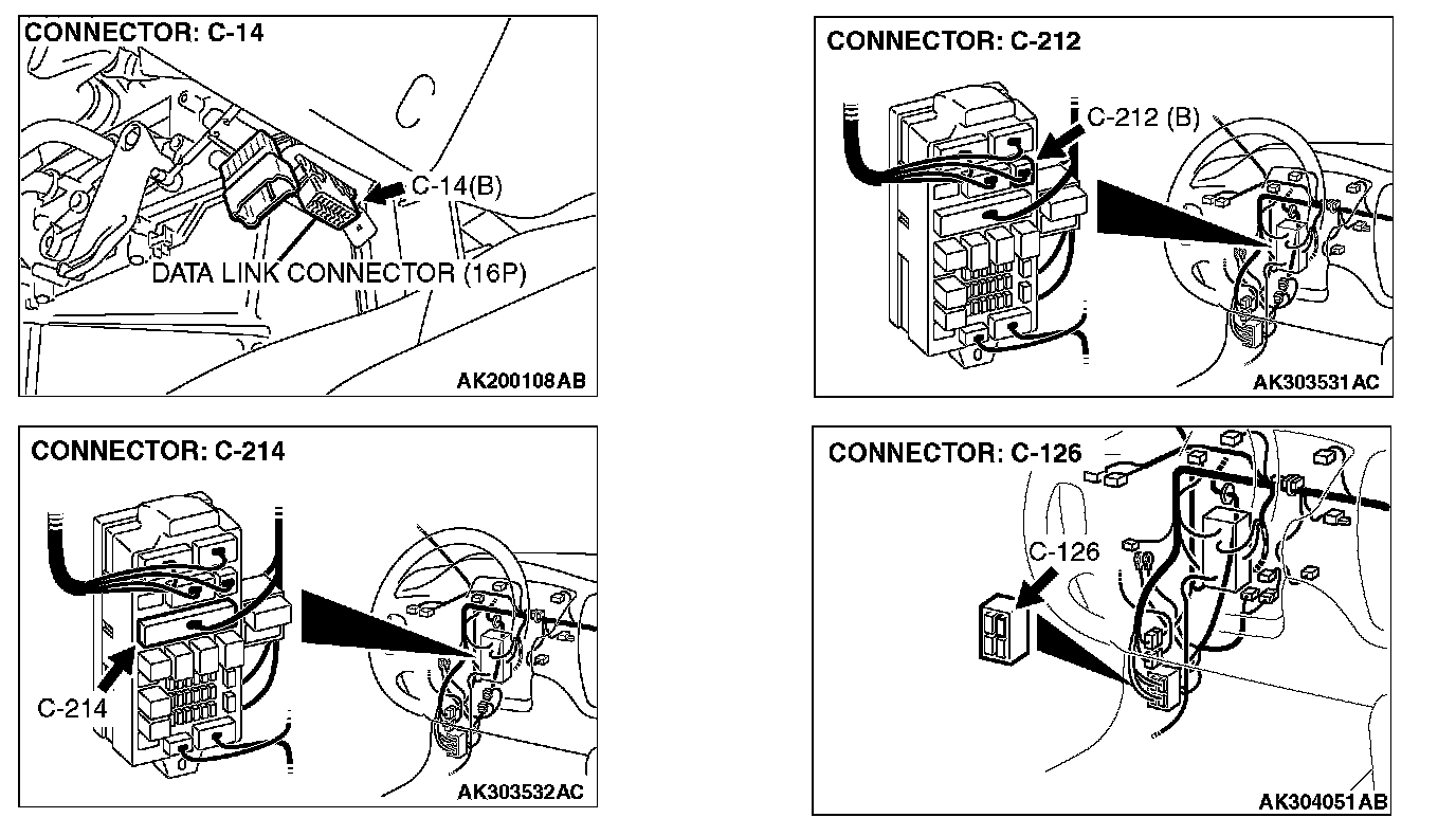 NO: Check harness connectors C-126, C-212 and C-214 at intermediate connector for damage and repair or replace as required. Refer to Harness Connector Inspection. If intermediate connectors are in good condition, repair harness wire between fusible link (1) and data link connector C-14 (terminal No.16) because of open circuit. Then confirm that the malfunction symptom is eliminated.