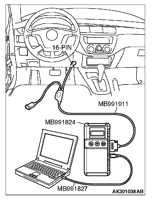 CAUTION: To prevent damage to scan tool MB991958, always turn the ignition switch to the "LOCK" (OFF) position before connecting or disconnecting scan tool MB991958.