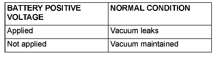 4. As described in the chart, check airtightness by applying a vacuum with voltage applied directly from the battery to the EVAP purge solenoid valve and without applying voltage.