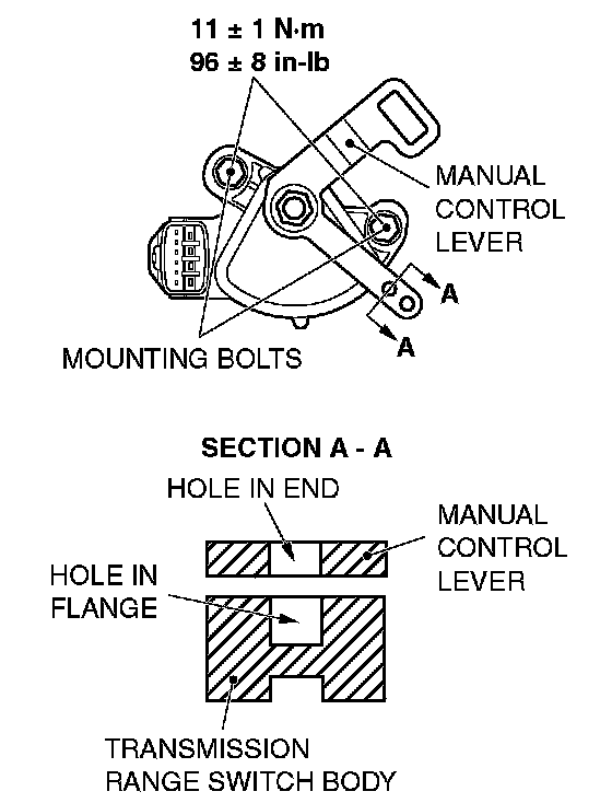4. Loosen the transmission range switch body mounting bolts and then turn the transmission range switch body to align the second hole from the end of the manual control lever (section A - A in the figure on the left) with the hole in the transmission range switch body flange.