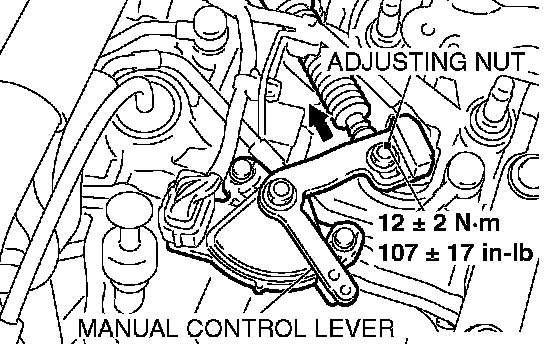 6. Gently push the transaxle control cable in the direction of the arrow, until the cable is taut. Tighten the adjusting nut.