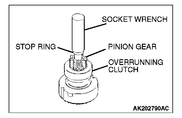 1. Press a long socket wrench to the stop ring. Then tap the socket wrench to remove the stop ring to the pinion gear side.