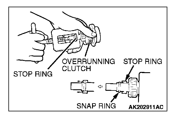 Using a suitable pulling tool, pull the overrunning clutch stop ring over the snap ring.