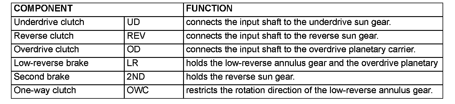 The transaxle is made up of the torque converter and gear train. A 3-element, 1-stage, 2-phase torque converter with built-in torque converter clutch is used. The gear train is made up of four sets of multi-disc clutches, two sets of multi-plate brakes, one set of one-way clutches and two sets of planetary gears. The planetary gears are made up of sun gears, carriers, pinion gears and annulus gears.