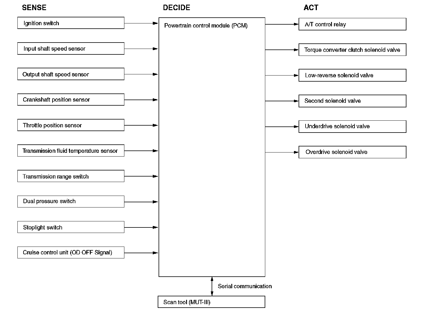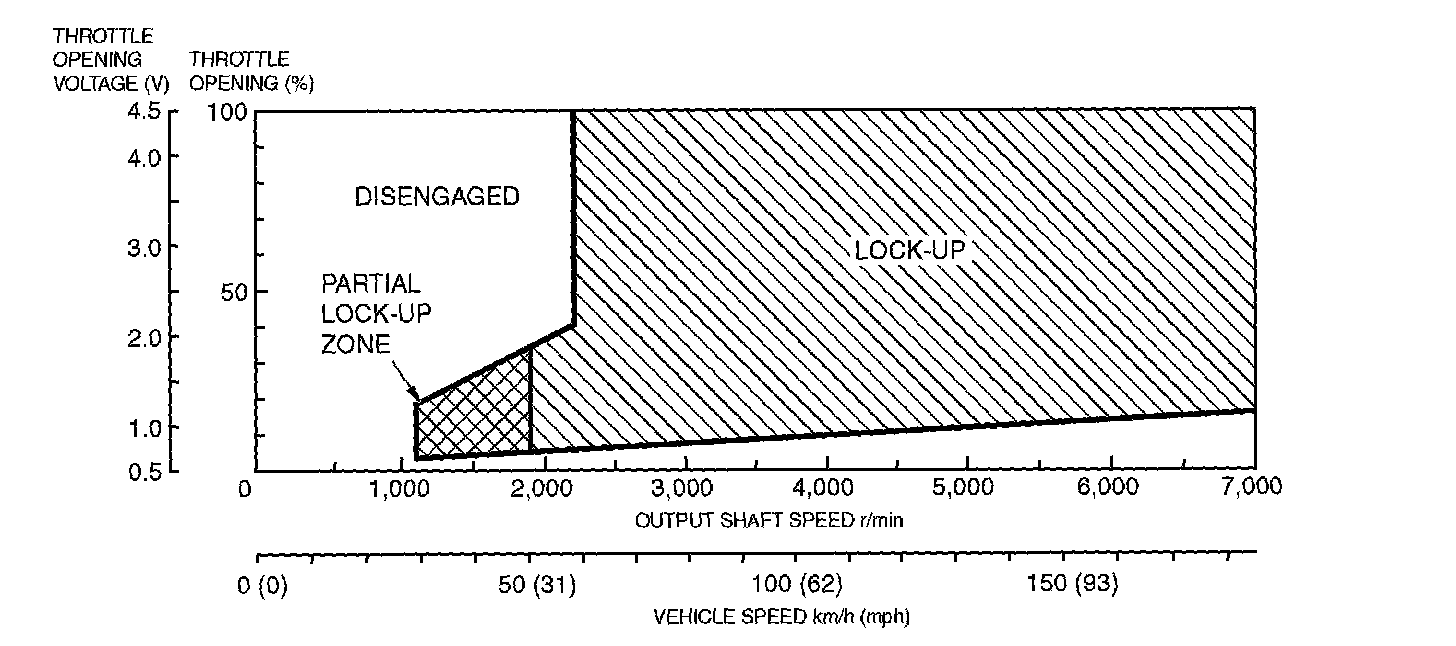 NOTE: Within 2-to-3 and 3-to-4 movement ranges, the PCM adjusts shift points according to the driving conditions by memorizing the accelerator pedal stroke and braking timing.