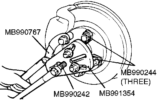 1. Use special tools MB990242 (puller shaft puller), MB990244 (puller bar), MB991354 (puller body) and MB990767 (end yoke holder) to push out the driveshaft from the hub and knuckle.