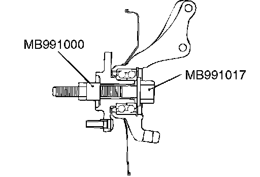 CAUTION: Do not apply pressure to the wheel bearing by the vehicle weight to avoid possible damage when the drive shaft is removed. If, however, vehicle weight must be applied to the bearing in moving the vehicle, temporarily secure the wheel bearing by using special tools MB991017 (front hub remover and installer) and MB991000 (spacer).
