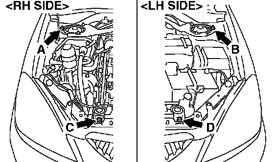 2) Set special tool MB991928 (engine hanger) to the front fender assembling bolts (A and B) and radiator support upper insulator attaching bolts (C and D) as shown.