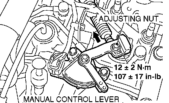 2. Place the cable stud into the manual control lever slot and install the nut loosely. Gently push the transaxle control cable into the manual control lever slot until the cable is taut. Tighten the nut to the specified torque.