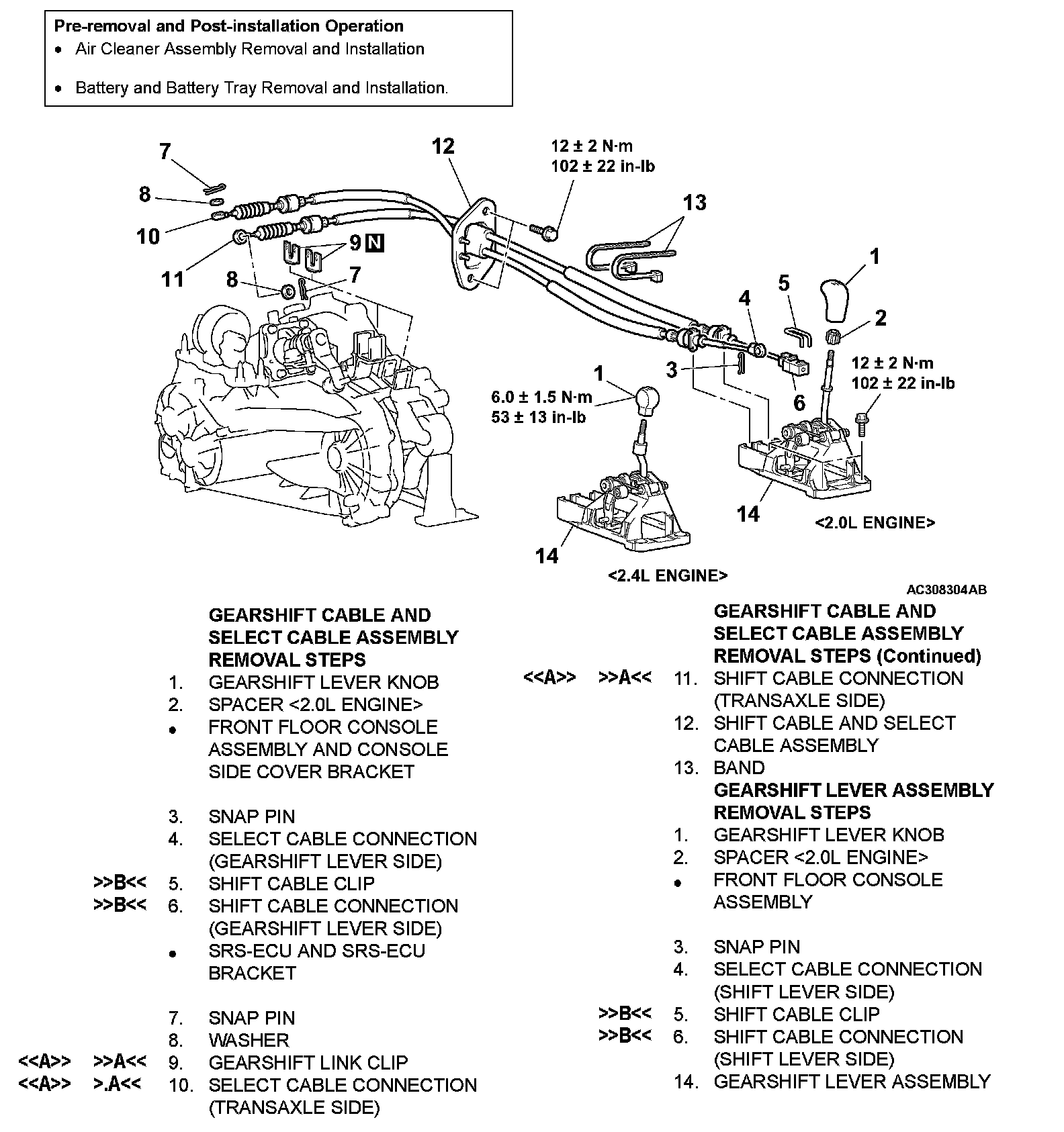 WARNING: Be careful not to subject the SRS-ECU to any shocks during removal and installation of the shift cable and select cable assembly.