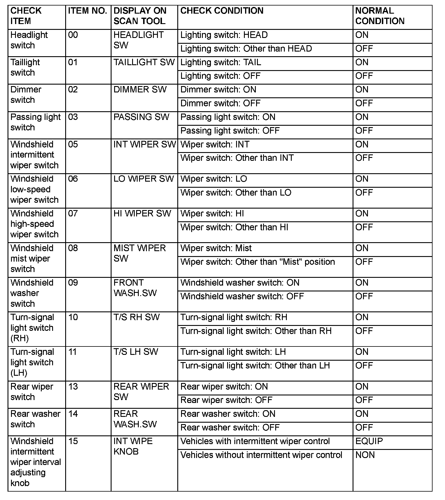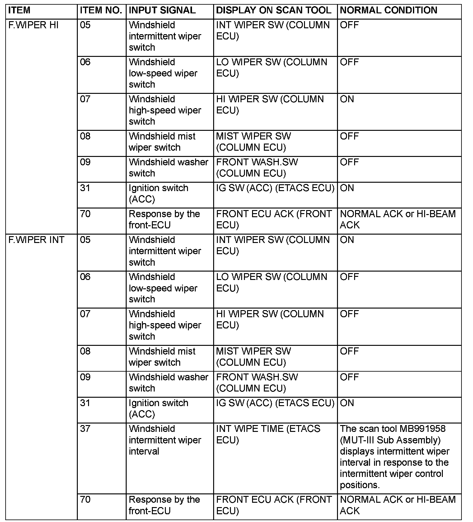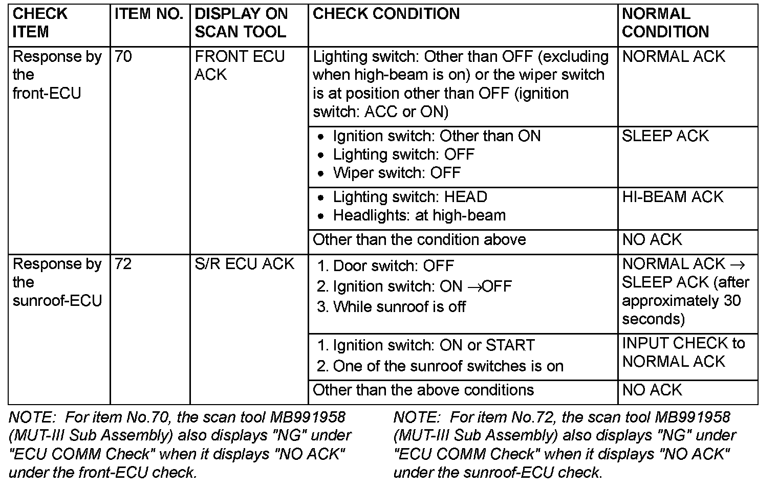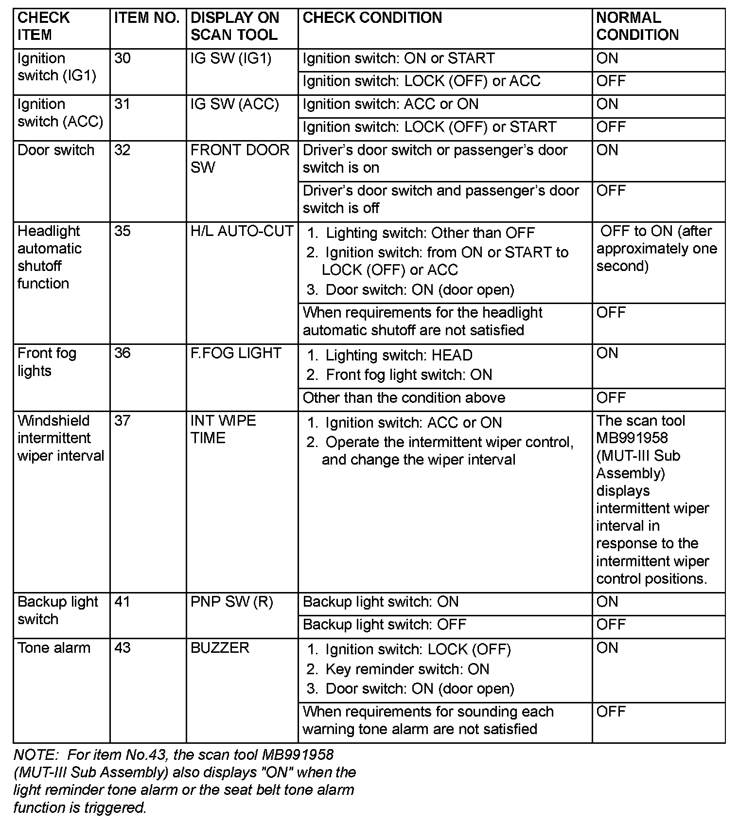 SERVICE DATA CHECKUse the scan tool MB991958 (MUT-III Sub Assembly) and the SWS monitor kit to check "Data List" or "Function Diag.". This "Data List" or "Function Diag." check is applicable for signals, which are transmitted and received through the SWS communication line. For input signals, which are not compatible with the SWS monitor kit, refer to the Pulse Check procedure (by using the scan tool or voltmeter).