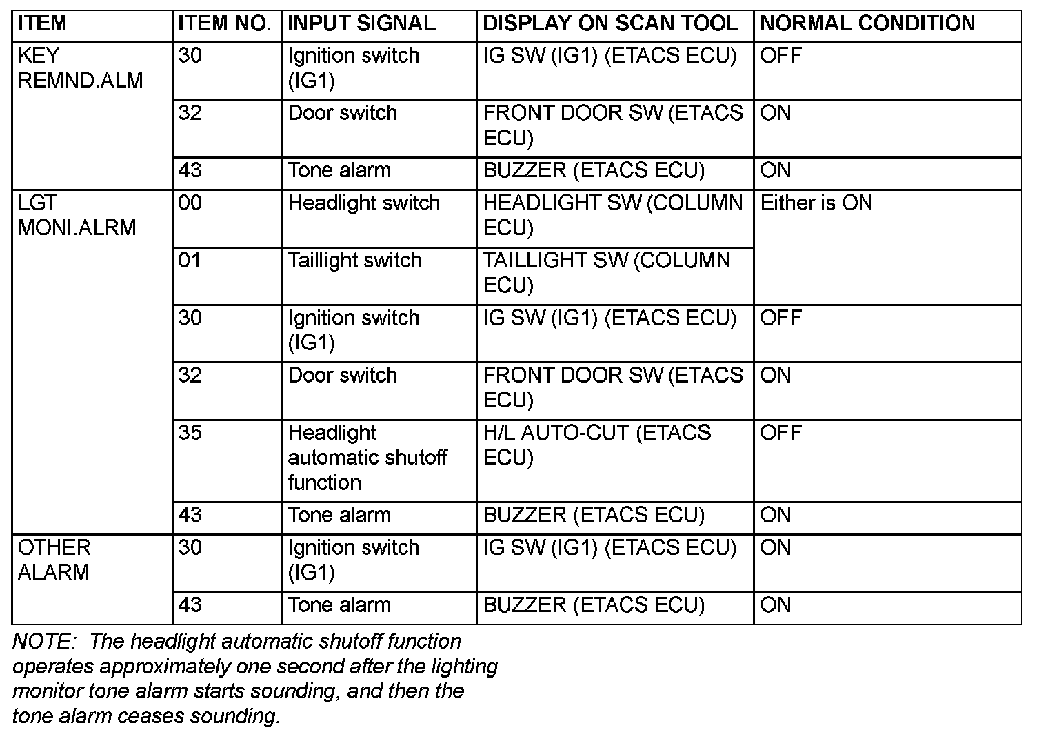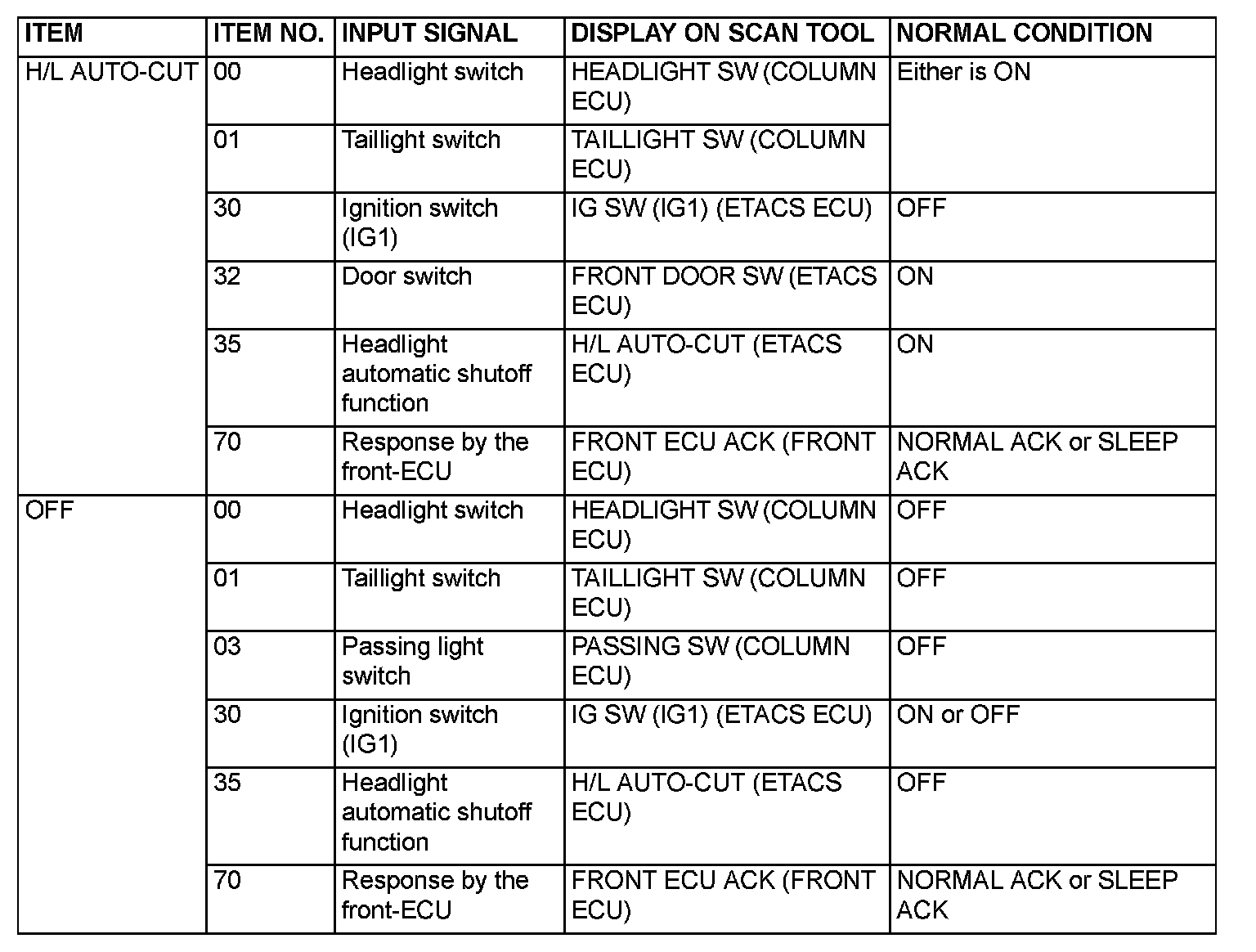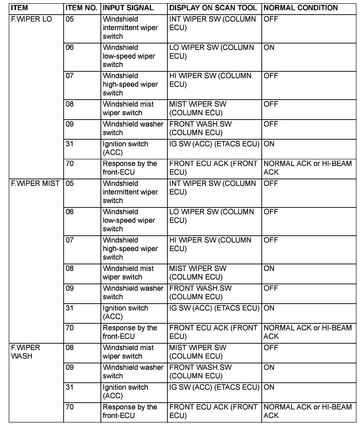 NOTE: If a problem is found in the "Service Data" check, refer to Input Signal Chart. Input Signal Chart